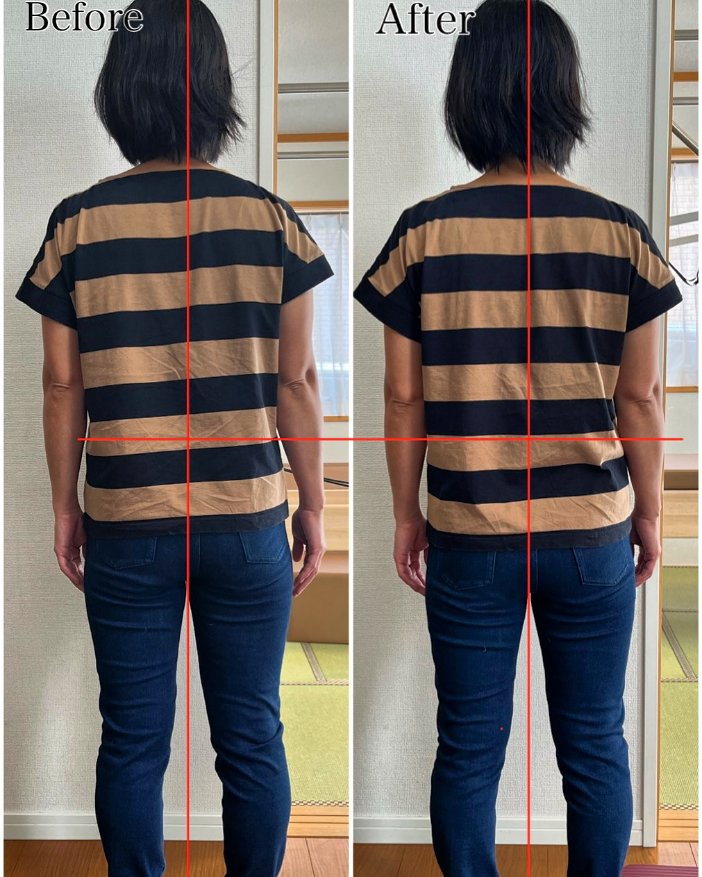 左重心になっていた身体がAfterはバランスが整って、ボーダーラインが平行に!軸が整いました。